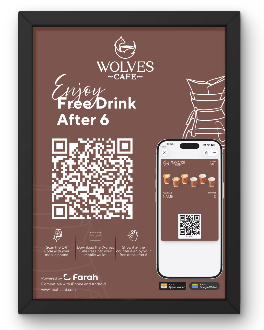 Save your loyalty card to Apple Wallet or Google Wallet. Every purchase turns into points or stamps automatically.